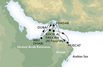- 10 dienų kruizo paketas: Vilnius, Dubajus, Abu Dabis, Khor al Fakkan, Muskatas, Kasabas, Dubajus, Vilnius